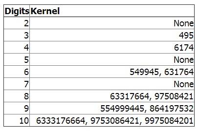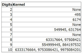 Per numeri con un numero di cifre superiore a 4 si è scoperto quanto riportato nella tabella, sempre fornita da Yutaka Nishiyama: